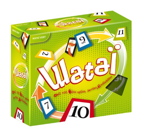 Dujardin - 1130 - Jeu de Cartes - Wataï Vert?Jeu de défausse et de rapidité très amusant où tous les joueurs jouent en même temps! Chaque joueur reçoit un paquet de cartes. Chacun place 5 cartes face visible devant lui et prépare un talon de 13 cartes qui viendront remplacer chacune de ces cinq cartes lorsquelles seront jouées. Les joueurs jouent alors tous en même temps en complétant en ordre croissant des tas de cartes dune même couleur. La manche s'arrête quand un joueur n'a plus de talon. On compte les cartes posées par chaque joueur et on recommence! Contenu: 4 paquets de 55 cartes identiques (dos de couleurs différentes), 1 déà 8 faces, 1 sac de rangement, règle et variantes. Pour jouer à 8 joueurs, rassemblez le Wataï bleu et le Wataï vert !. Nb joueurs : 2 - 4. Durée : 30 mn. De 7 ans à 120 ans.